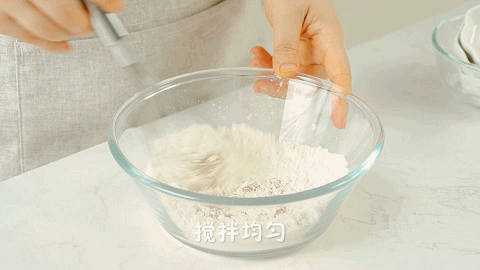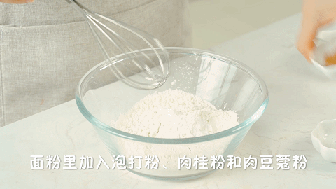4、将100克中筋面粉、2克泡打粉、1克肉桂粉和1克豆蔻粉,搅拌均匀,混合粉就做好了