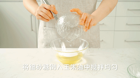 5、将100ml玉米油和90克细砂糖混合搅拌均匀