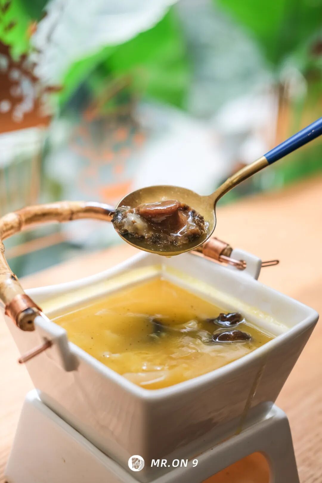 10cm左右的正方形带自主加热的陶瓷器具,让这道听着富贵的菜品,立刻放下了姿态。