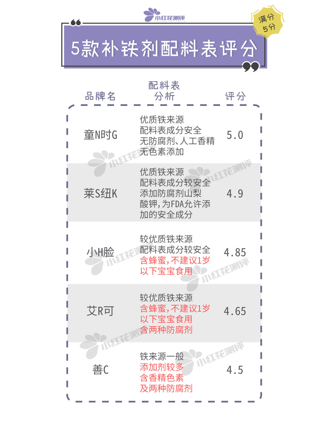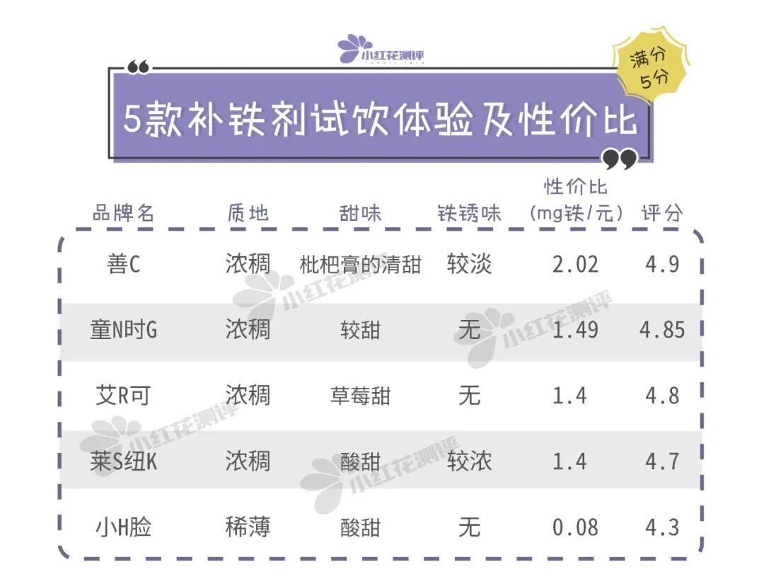 五款补铁剂均有不同程度的酸甜味,如果稀释在米粉或者温水中的话,都不算很明显。