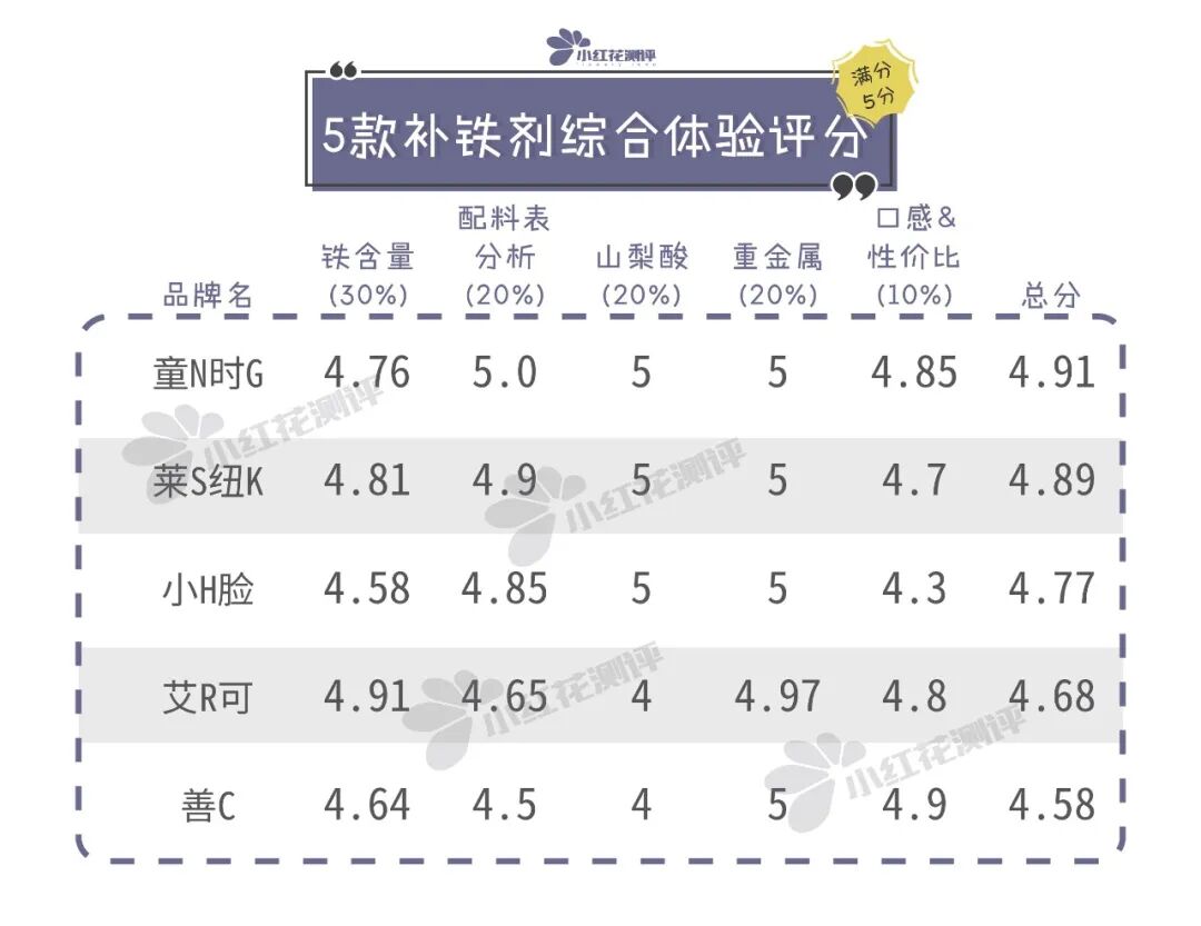 根据标称含铁量和买样时的价格计算,小H脸由于含铁浓度较低,一次需要饮用近半瓶,所以性价比较低。综合以上5个指标,根据不同指标重要性,划分权重再赋分,最后加权平均,得出5款补铁剂的总体评分,如下图所示:* 需要说明的是,这一评分是在给6个月以上~3岁以下宝宝服用的前提下给出的。测评结果仅对本次的送样负责,且只针对单一产品,不包括同品牌下的其他产品。