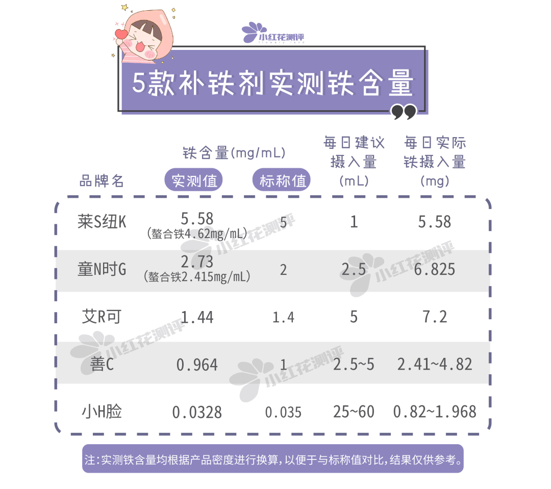 五款补铁剂的实测铁含量均较接近标称值,表现都很不错。