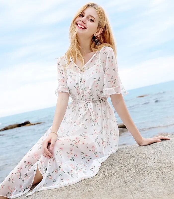 雪纺白裙配上植物系小印花,确定不是大自然里的精灵嘛!