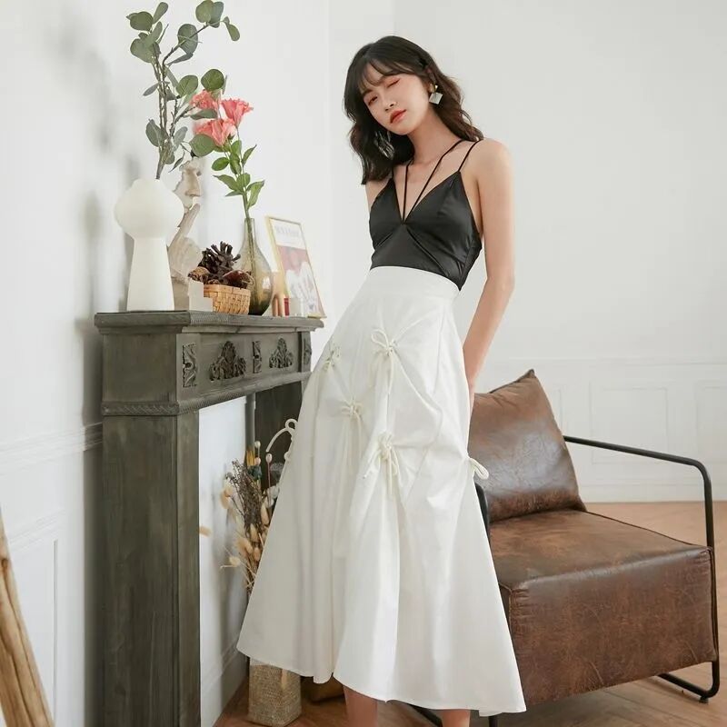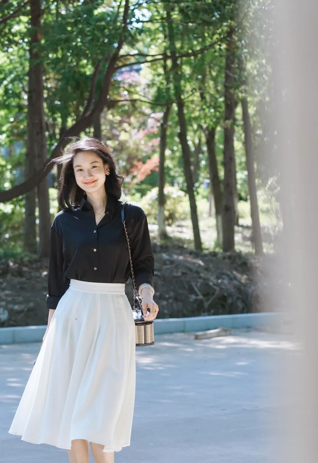 白色半身裙也是OL风穿搭的精华单品,像这位博主,用白色A字裙搭配黑色衬衫,简约而不单调,看起来甜美又大方~