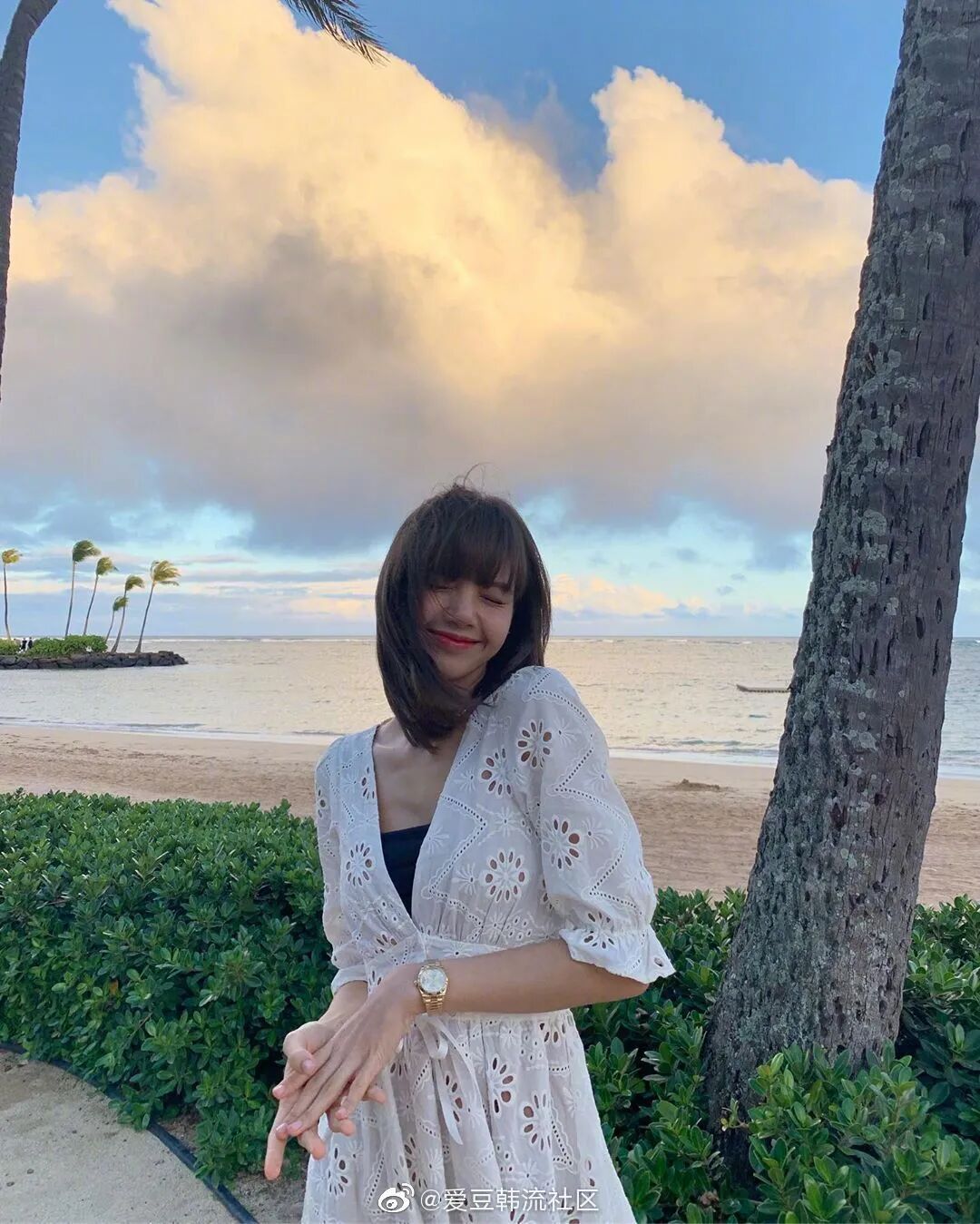Lisa这件大V领钩花小白裙,就很有度假风情啦,仿佛海的女儿~~