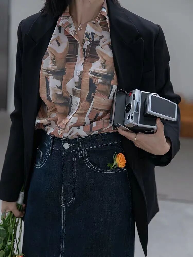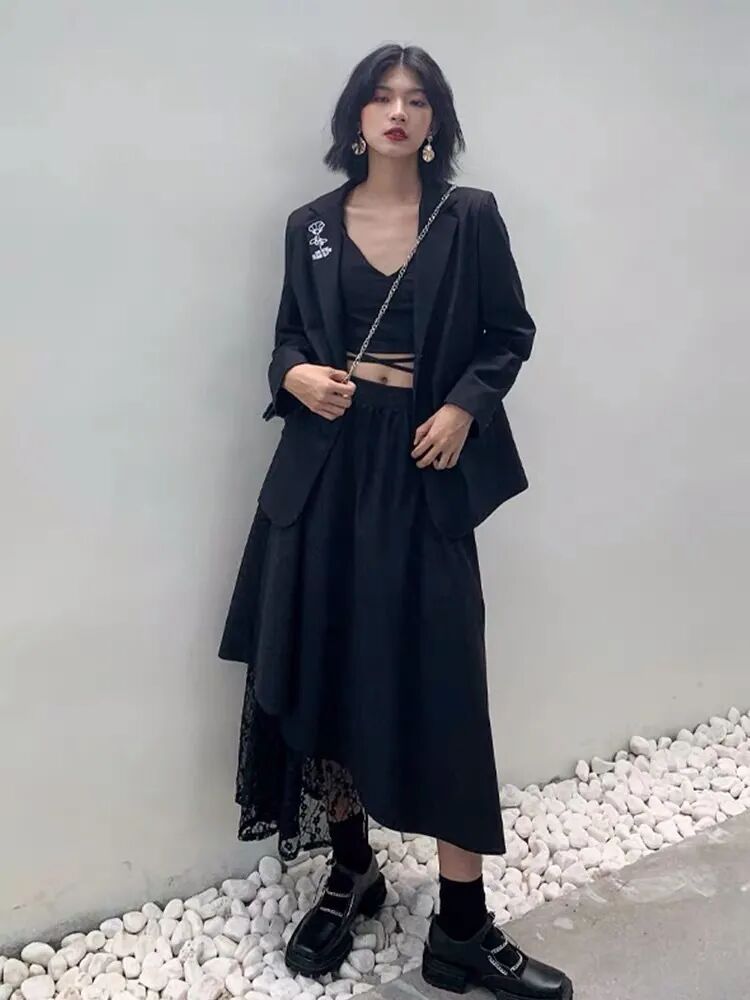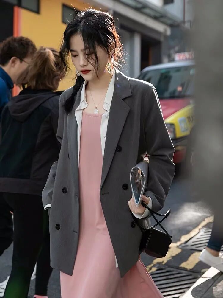 衬衫+西装的穿搭可不局限于和裤子穿搭,连裙子都可以。