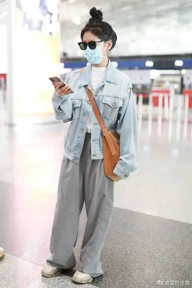 同样穿搭的还有宋妍霏,只是宋妍霏下身搭了一条牛仔裤,看上去更复古一点。