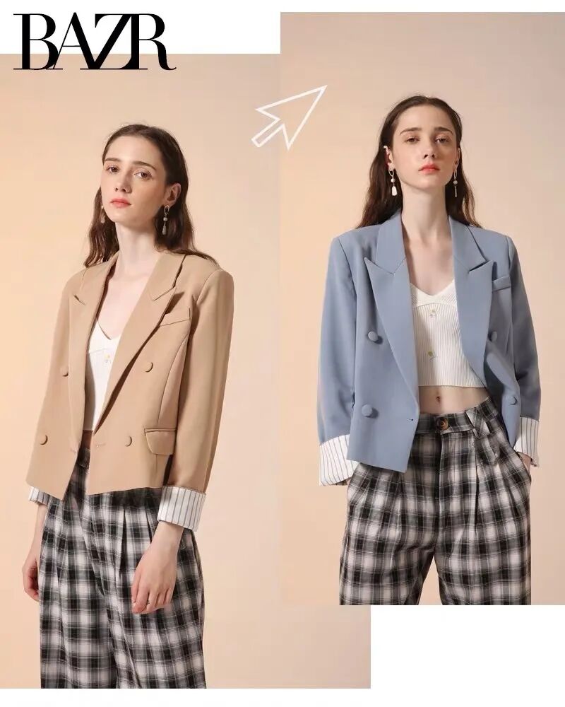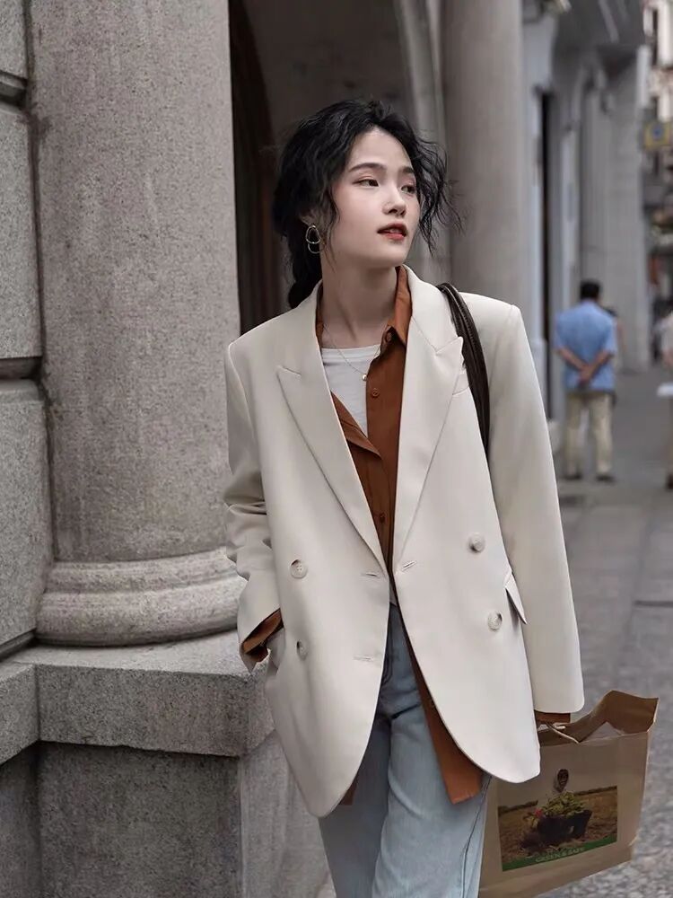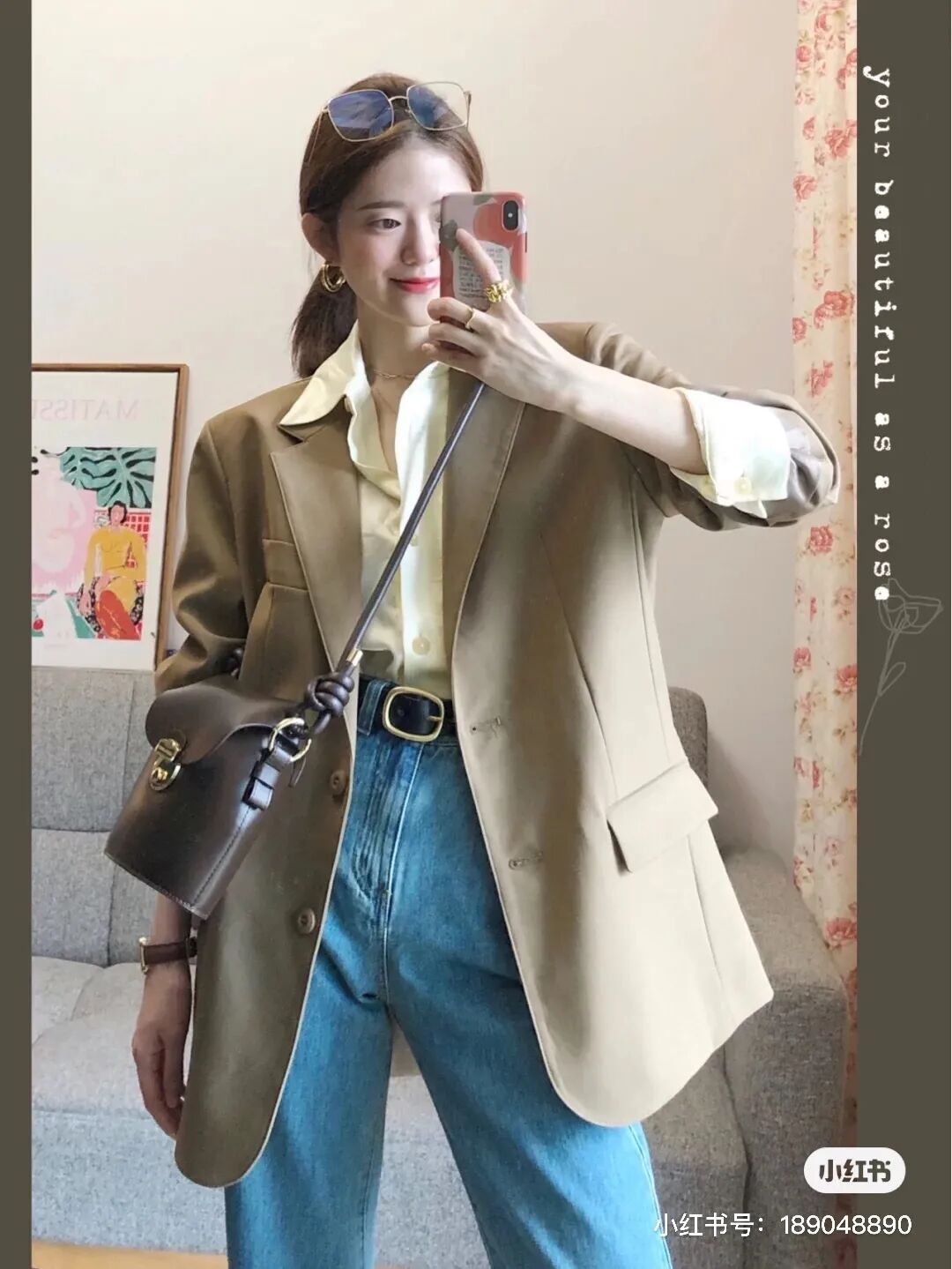 在西装里面先搭一件衬衫,下体穿上高腰牛仔裤,OL感满满,都市丽人那味儿立刻就出来了!