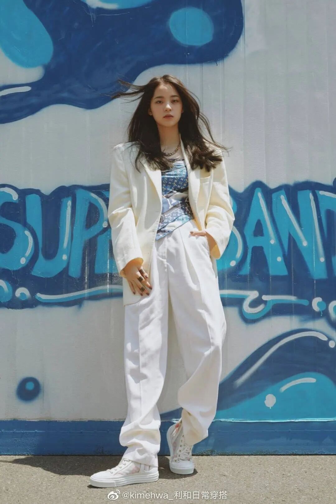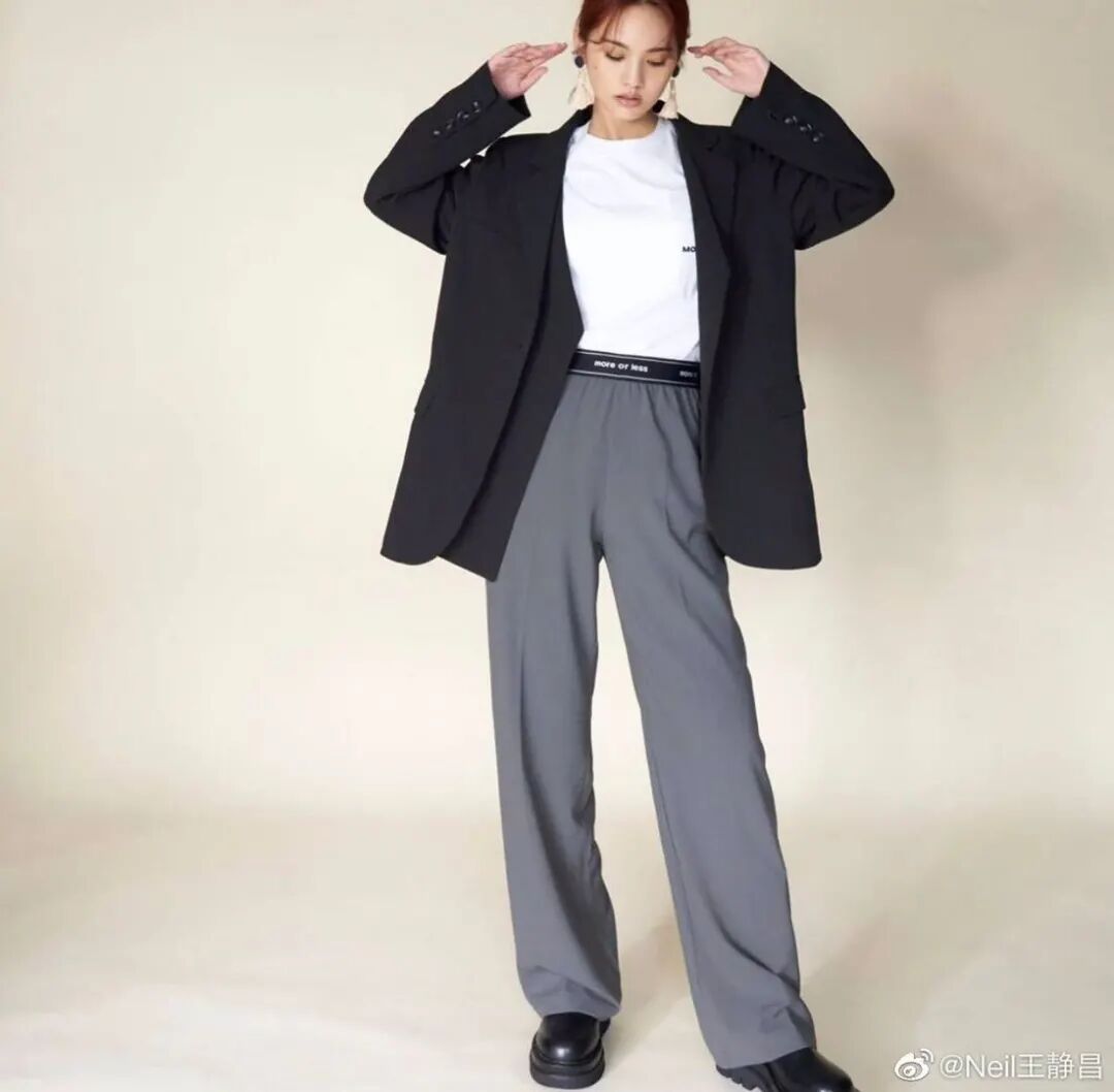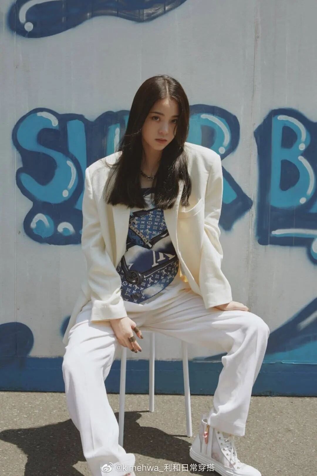 宽松款的西装外套里面搭上宽松T,非常符合欧阳娜娜的气质!