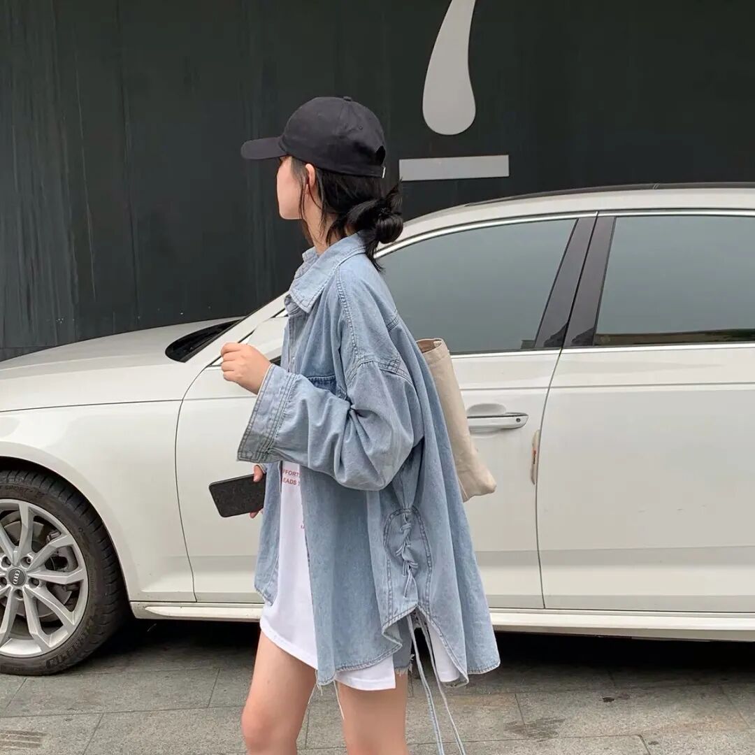 如果想要看上去无辜一点,里面的oversizeT恤一定要选对,长度和牛仔外套齐平。