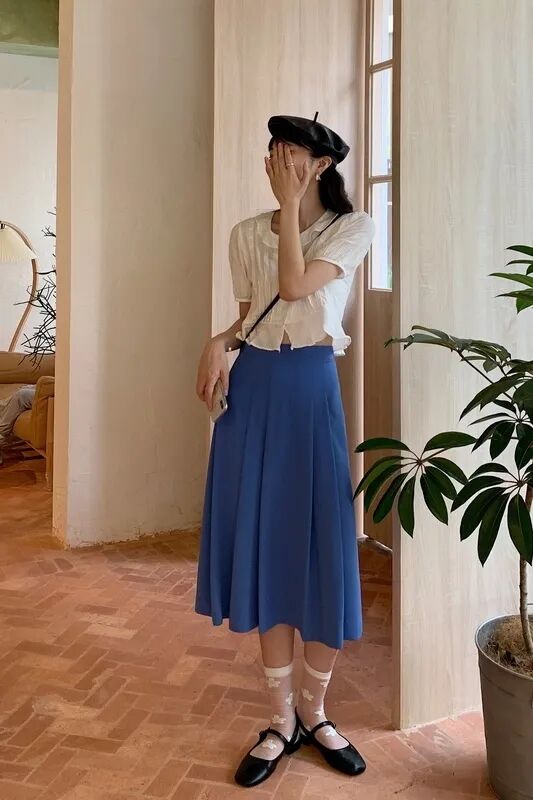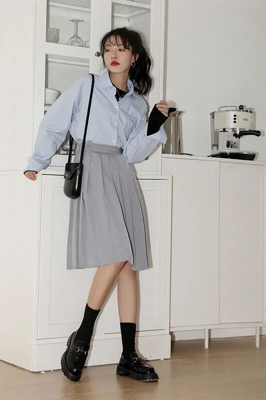 还可以买长一点的A字修身百褶裙,来搭配方领、泡泡袖or蕾丝上衣。