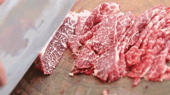 它是按照肉类本身组织排列的方向去切的,这样切出来的肉,烹煮过后也不会因加热收缩而破碎,成品仍保持着整齐和美观,而且肉质也更有嚼劲。