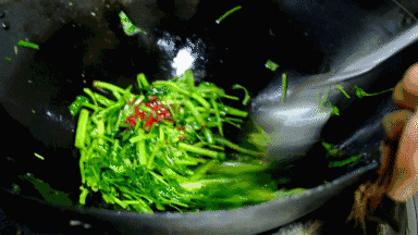 让盐在热油里融化,再下青菜大火快炒。这样一来,盐分能逼出青菜的一部分水分,而这些水分也能更好地保持青菜脆绿的色泽。比如空心菜、茼蒿。