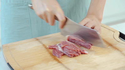 这种切法,就比较常用于切猪里脊肉、鸡肉或者是肉丝了。
