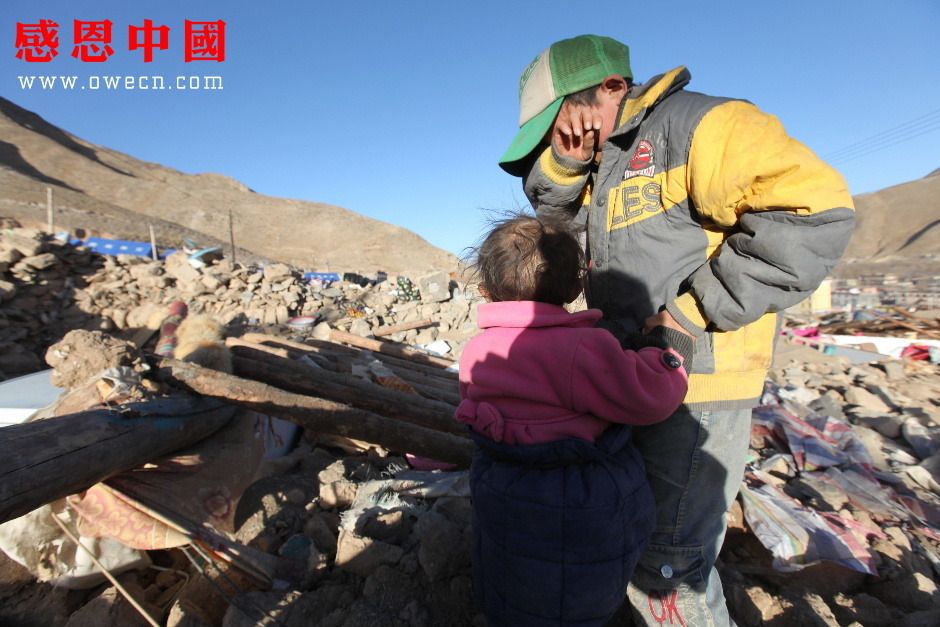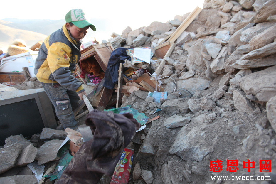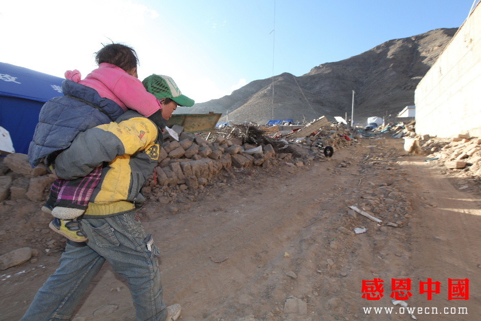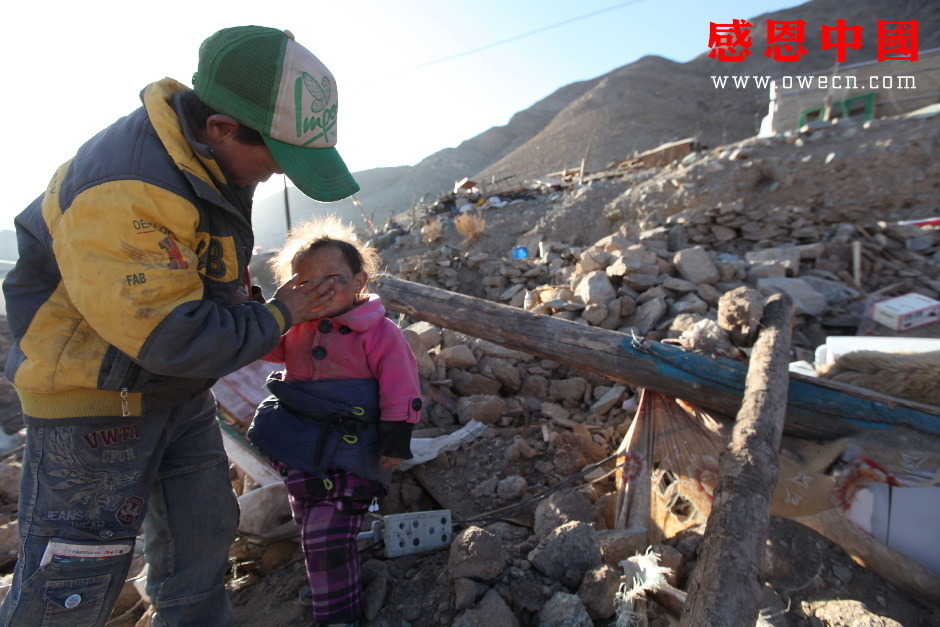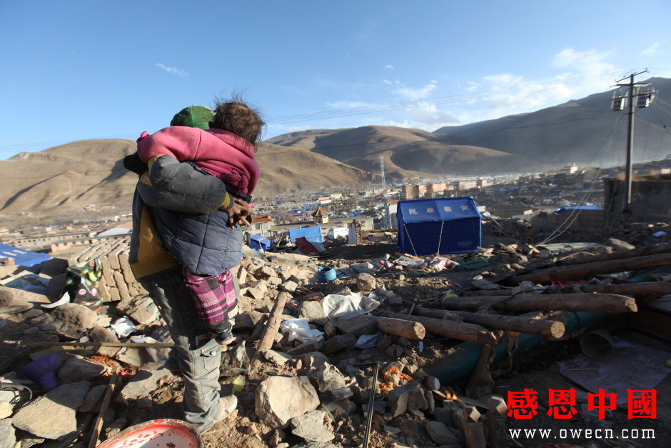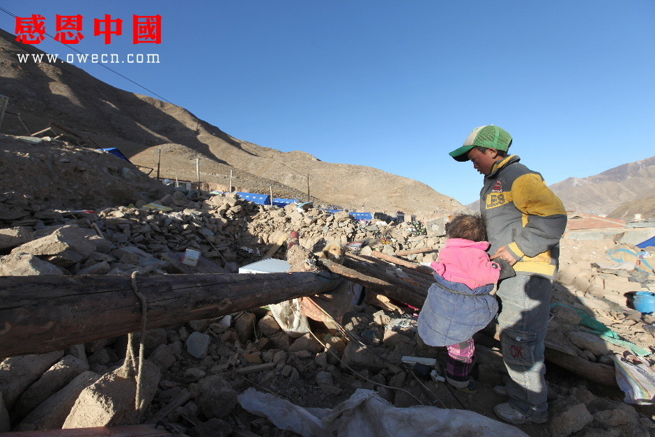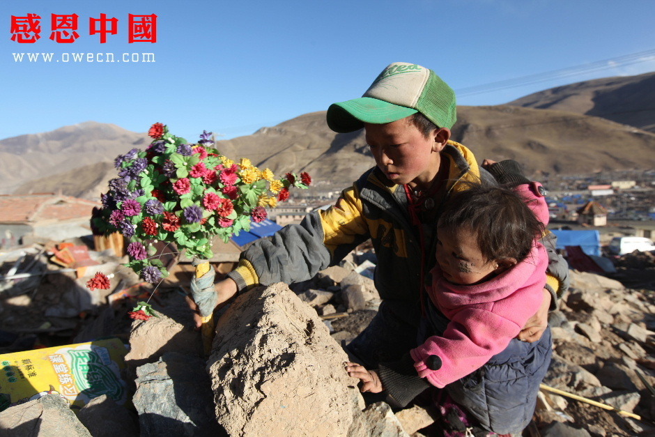 背着妹妹来到已成废墟的家,吾金旦周放下还在抽噎的妹妹说道:“索南求措,你的腿不好,你先在这里站着好不好?我先到泥巴里把妈妈最喜欢的塑料花给挖出来好不好?”
