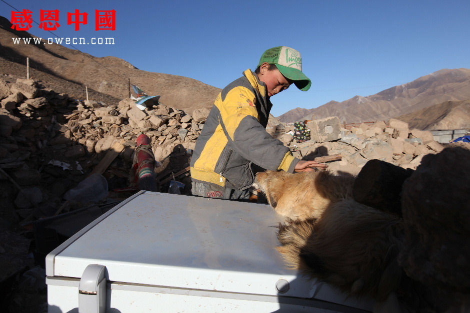 安慰好妹妹后,吾金旦周来到躺在冰箱上的小狗旁:“这条小狗是我们家的,自从地震到现在它都一直躺在这里守着不走,我也想把它带到亲戚家里和我一起住,但是它就是不肯走,我只能每天从亲戚家里弄点剩饭给它吃。”