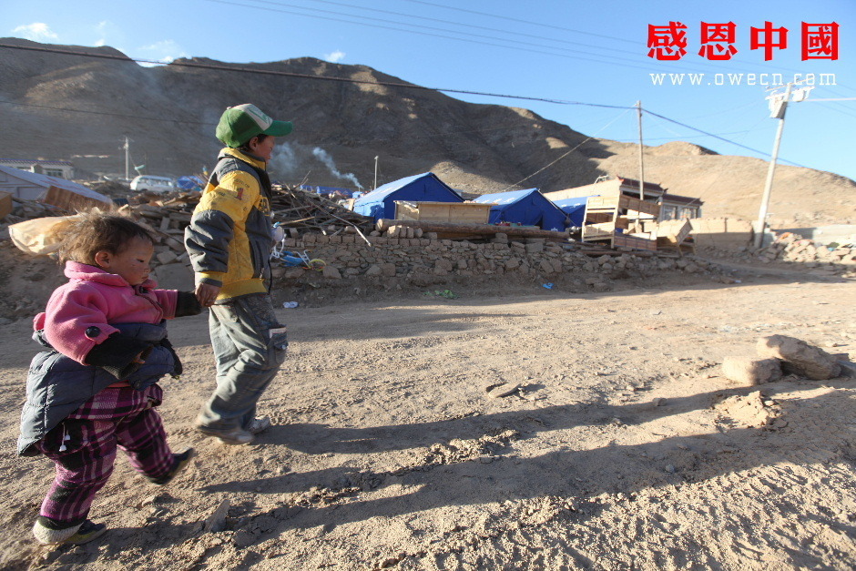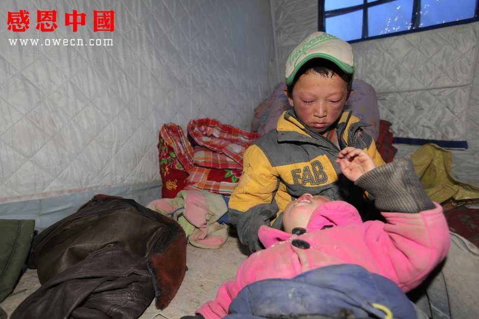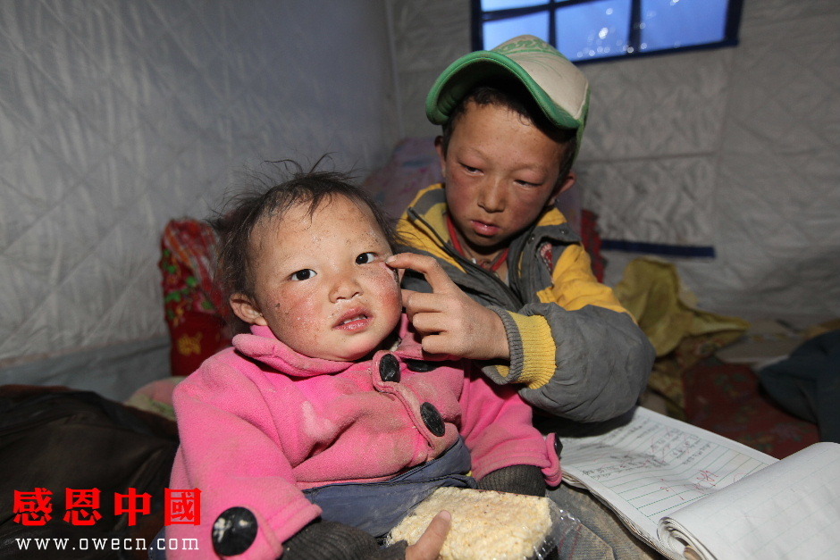 告别妈妈,吾金旦周吃力地抱着妹妹往亲戚家的救灾帐篷走去:“索南求措,我们今天也找到妈妈最喜欢的花了,妈妈说她不打算回来看我们了,我们的爸爸也跑了,不要我们了,以后这个世界上就只剩下我们两个人了。”
