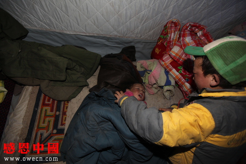 还没有喝完水,吾金旦周就听到睡在床铺上的妹妹开始哭喊,他马上跑过去:“索南求措,是不是又做恶梦了?不要害怕,哥哥我就在你身边,听哥哥的话不要哭了好不好?等下我就带你玩好不好?”