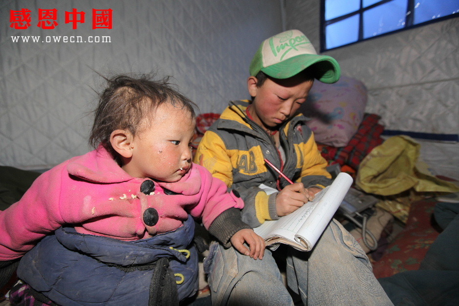 看妹妹索南求措终于不哭了,吾金旦周就拿出书本:“索南求措,听我的话不要再闹了好不好?我也好几天没上学了,这些书地震以后就没有看过,我怕以后上学了跟不上,我还是先看会书,看完了就陪你出去玩好不好?”