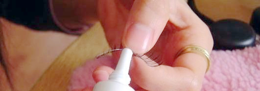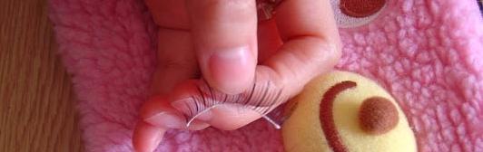 量好长度就可以开始涂胶水了。不必涂太多,如果不好控制,可以用棉花棒沾胶水,再涂到假睫毛的基部上。