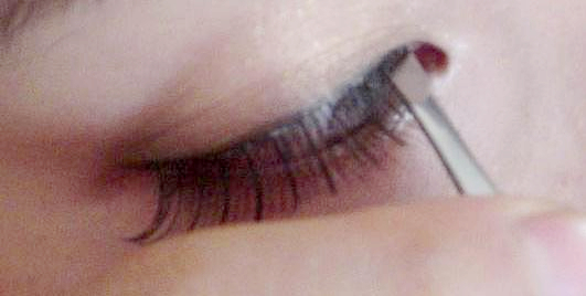 正式开始贴了。第一步:用平头镊子夹住假睫毛中间靠近根部的地方。目测一下,假睫毛的外侧对准外眼角。然后对准中间这个点,一粘就上去了。贴在眼皮上面,真睫毛的上方(千万别贴在真睫毛上,因为这样是贴不牢的)。贴得离开自己睫毛越近越逼真。