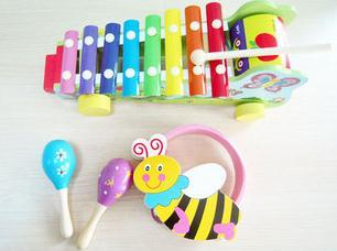 1.清脆悦耳的八音琴,响亮的沙锤,即可手摇又可拍打的铃鼓,给予宝宝不同的听觉刺激,激发对音乐的学趣
