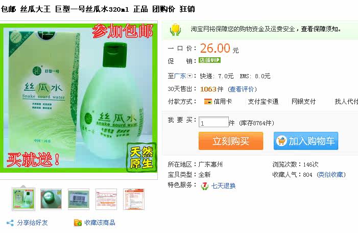 1、正品丝瓜大王巨型一号丝瓜水320ml  买1支送5个纸膜 淘宝价:28元/瓶 团购价25元/瓶包邮