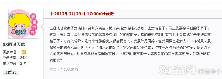 这次的试用真的很满意啊~客服小姐没有因为是免费试用而降低服务,鞋子也没有因为是免费试用而降低质量!