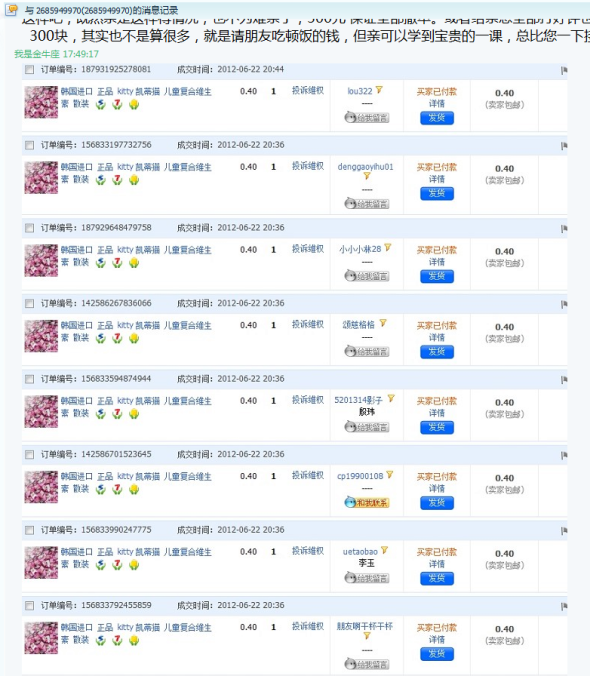 6月23日,玩了大半天,因为天气热的受不住,下午3点多,我们就早早散了回家,虽然是节假日,但是几年的习惯使然,我还是开机关注一下店铺,打开旺旺的时候我就惊呆了 ,一下子弹出好多卖出消息提示,美屁屁的打开淘宝“已卖出宝贝”一看,心一下子凉到了底。。。我就是再无知,也知道自己遭到差评师围攻了!