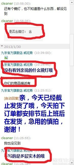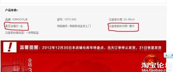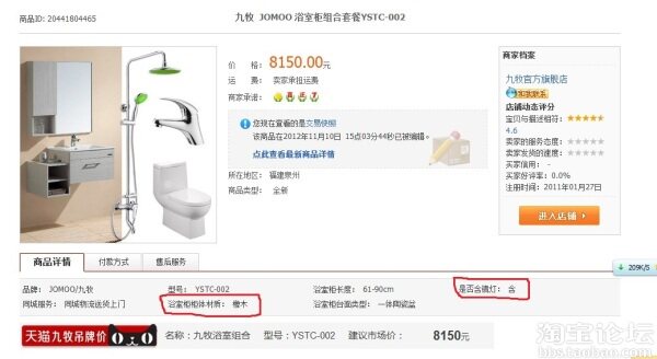 浴室柜的商品描述是“橡木”、“多层实木”(后面这项当时没注意到,tnnd坑爹啊,还以为是全实木的,不然是懒得去买的,都是源于对九牧这牌子而且是官方旗舰店的信任)。还含有“镜灯”,下面是截图: