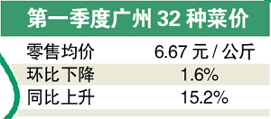 昨天,广州市物价局发布2014年第一季度广州蔬菜价格分析及后期走势分析,第一季度广州市32种蔬菜综合零售均价6.67元/公斤,环比下降1.6%,同比上升15.2%。与其他五个副省级城市比较,广州市第一季度17种蔬菜均价约为7.01元/公斤,排在最后一位,远低于厦门、深圳、杭州、宁波、西安等五地。