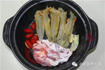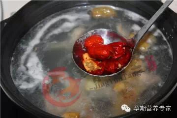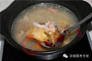连水带花胶和姜片一并倒进汤锅中,再加上去核后的红枣,盖锅等喝。虽然老火汤入味,但是嘌呤容易高,所以,煲大概1.5小时就可以了。