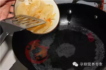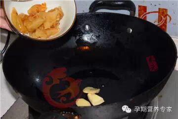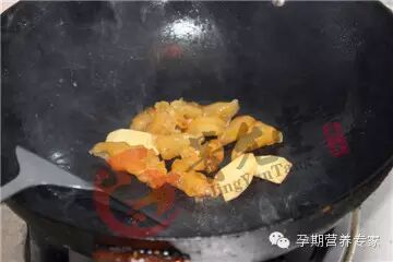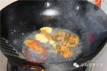 把炒锅沸水倒掉后,擦干锅子,放少量油,然后把姜片放进去煲炒10秒,再把焯水后的花胶倒进锅内一同爆炒30秒。(注意:这步去腥关键!)