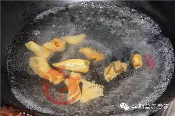 同时,另外用锅放水煮沸,然后把泡软后的花胶每条剪成3段再放进水中焯水30-60秒,然后捞起。(注意:这步去腥关键!)这个时候,花胶就会一缩,变成很小的1个哦~不急!