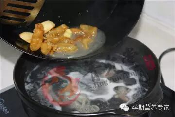 在煮沸了一阵子的汤锅中勺出1勺沸水来,直接浇到炒热的花胶上,顿时白烟四起~淡定!