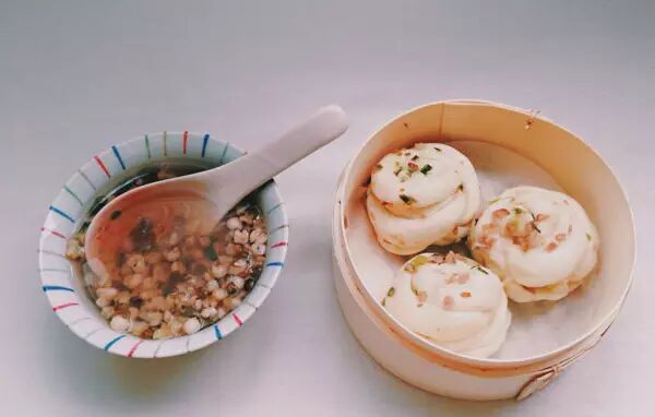 [p=25, null, left]7. 绿豆薏米汤+花卷[p=25, null, left]