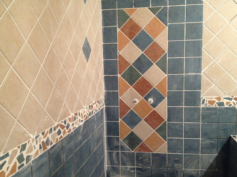 这是厕所,刚刚涂上去只擦了一次,把填缝剂用水调成糊状,抹上去,等半干的时候就可以把边上的擦掉了,如果等它干透了就很难擦干净了,需要专业的清理液才可以。我们第一次搞这个东西,不太懂,有些地方没有擦,结果第二天擦不掉了,还特地在网上买了瓶药水才擦干净的。所以自己搞这个事情的亲们,一定要记得擦干净再走啊~~~呵呵