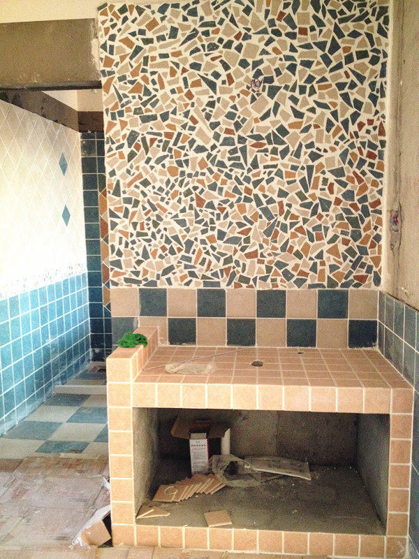 这里是洗脸台,因为厕所这么一搞是断断放不下这东西了,于是就做在外面,正好有这么一块地方,非常适合的(PS:早上起来肯定是不会打架了哈哈,要上厕所的上厕所,要洗脸的洗脸,适合我们家)另外,用碎砖贴的这个镜子背景墙,实在是超值了,都是用废砖贴的,最后把所有的瓷砖都用掉了,只剩下完整的一两片,也就是说这次购物没有怎么浪费瓷砖哦,非常开心,好看又省钱。