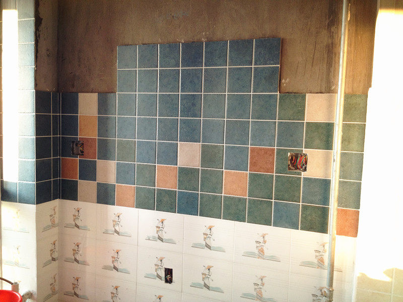 靠外面是洗衣台的地砖,采用了一个非常花的五色拼贴,阳光照进来的时候,给人感觉非常欢快,哈哈,洗衣服的时候也会心情很好吧,可惜角落里洗衣机一放,就把地面遮掉了一大块,真是可惜了~~~ 客厅的地砖采用的是50*50cm的仿古砖,是当地市场上买的,这个就是江浙这边产的砖,师傅说就质量而言明显还是我网上买的那些好多了,对此我非常得意啦,说明这次购物非常成功呢!不过这款地砖倒是很便宜的,本来想在网上买圆角砖带有花片的那种,但是那个价格贵了些,因为瓷砖这块已经超支了,所以才在当地买了70多块钱一平米的这款,不过样子还可以哦,来我家的人都说漂亮,哈哈~~~ 下面上几张填好缝的照片(PS:缝是我和CL一起填的,因为泥水这块,师傅都喊超时了,比别家多了三分之一的时间,工钱贵啊,于是就自己填了。后来木工师傅来的时候,直夸泥工的这缝填的好,害的我们得瑟了好一会儿) 这是厕所,刚刚涂上去只擦了一次,把填缝剂用水调成糊状,抹上去,等半干的时候就可以把边上的擦掉了,如果等它干透了就很难擦干净了,需要专业的清理液才可以。我们第一次搞这个东西,不太懂,有些地方没有擦,结果第二天擦不掉了,还特地在网上买了瓶药水才擦干净的。所以自己搞这个事情的亲们,一定要记得擦干净再走啊~~~呵呵 这是厨房的,这里已经全部搞干净了,这下学乖了。忘记说了,底下要做柜子那个地方的花砖是市场上买的,1元一片,买了30几块钱,再加上之前有多余的砖就贴下面了,有些人家是不贴的,其实没什么关系,可贴可不贴的,我是觉得贴了清爽一点就贴了。 这里是洗脸台,因为厕所这么一搞是断断放不下这东西了,于是就做在外面,正好有这么一块地方,非常适合的(PS:早上起来肯定是不会打架了哈哈,要上厕所的上厕所,要洗脸的洗脸,适合我们家)另外,用碎砖贴的这个镜子背景墙,实在是超值了,都是用废砖贴的,最后把所有的瓷砖都用掉了,只剩下完整的一两片,也就是说这次购物没有怎么浪费瓷砖哦,非常开心,好看又省钱。