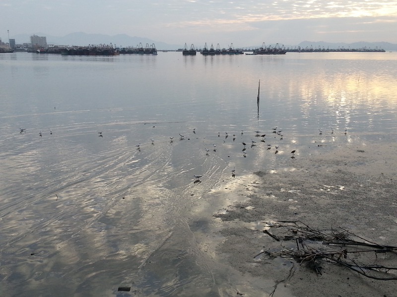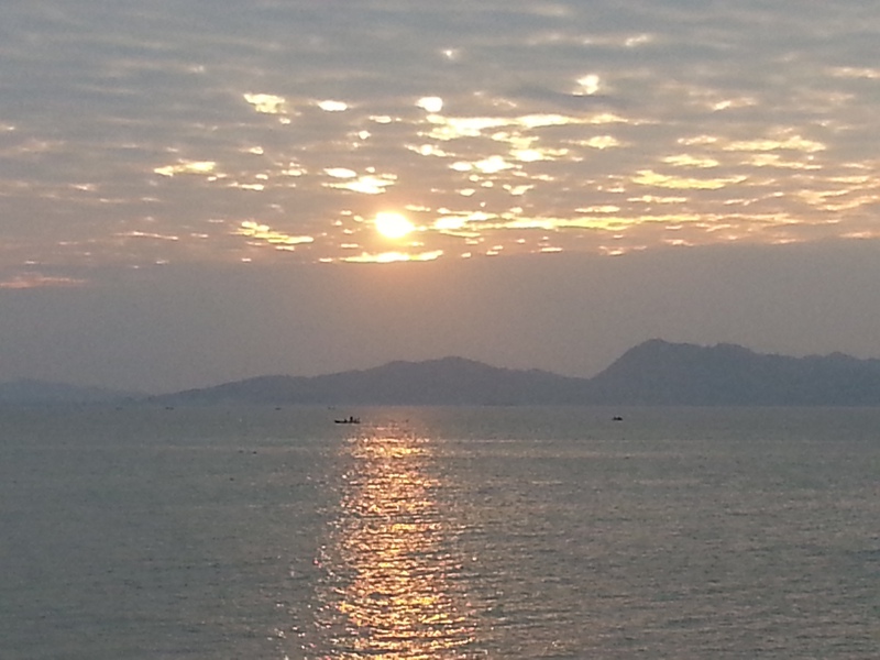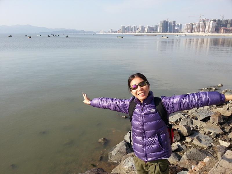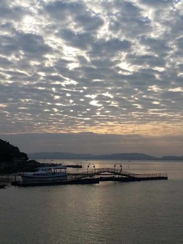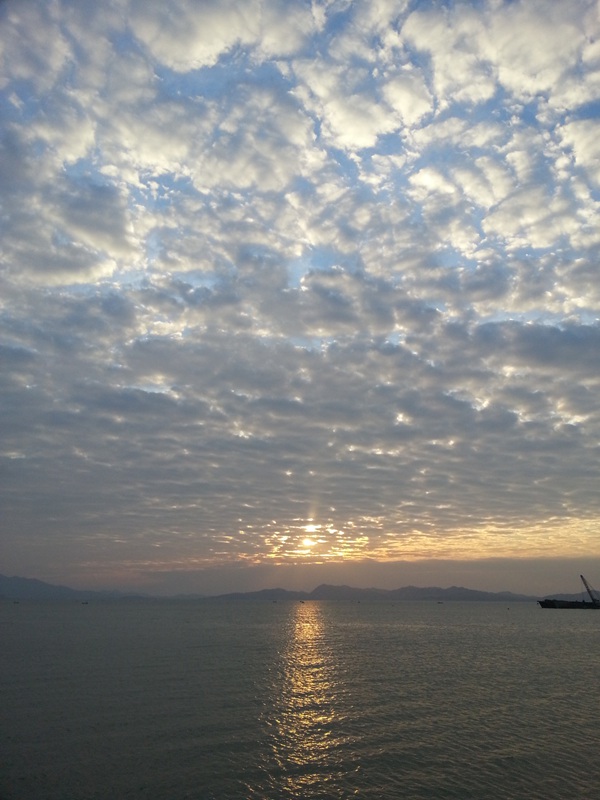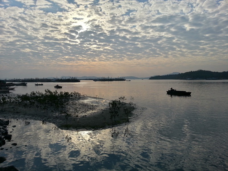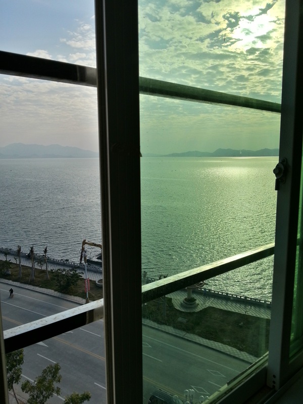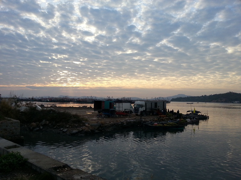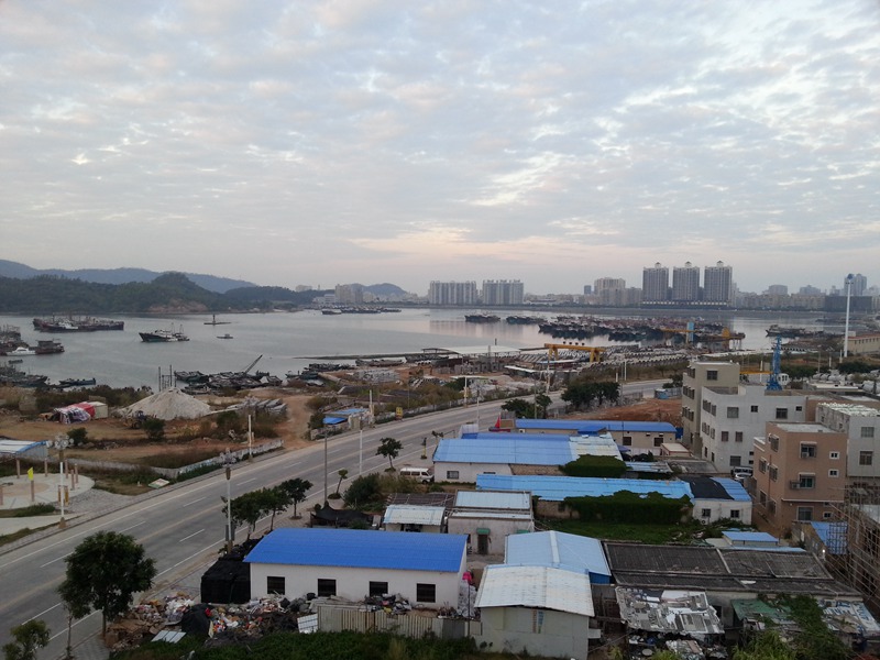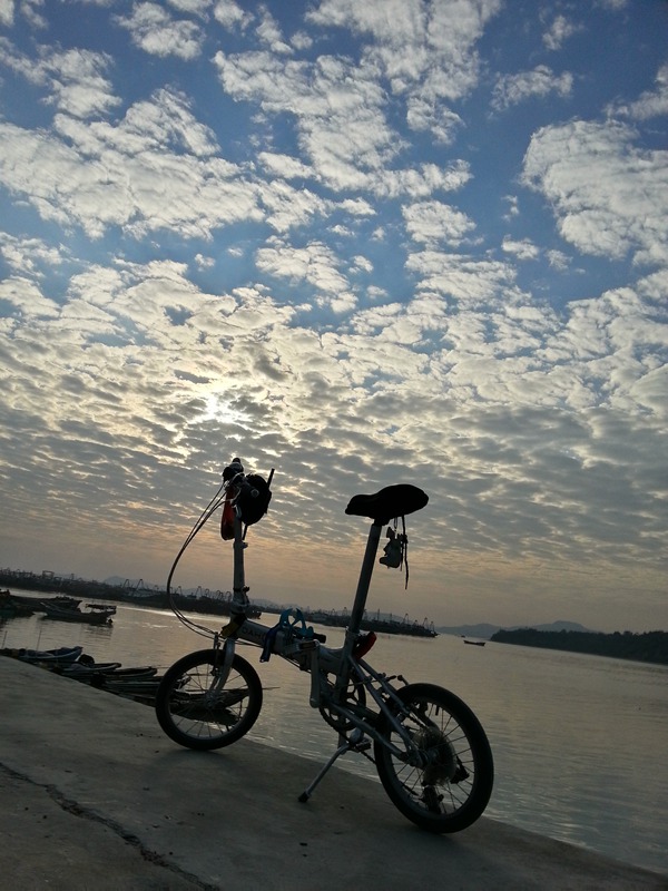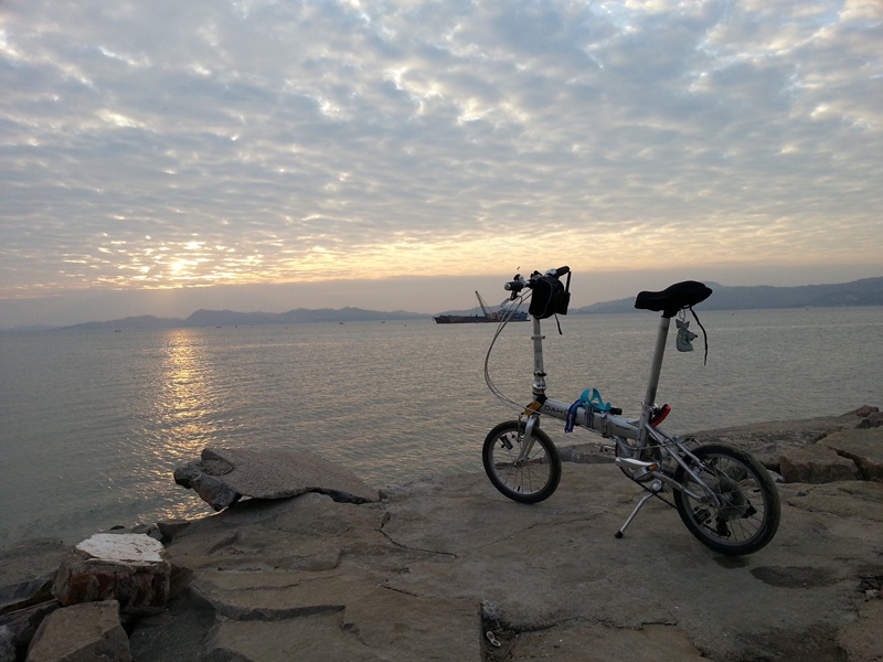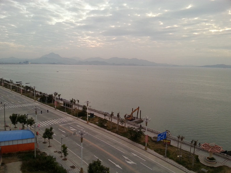 经过前一晚的吃完呕,呕完吃的过程,来到一个充斥着各式各样美食的地方,作为吃货的我,根本无法安睡。晚上的海景房看不出什么景色,早上起来,从窗口望出去,太阳刚刚出来,映照着内湾海岸。趁着老婆和孩子还没睡醒,于是便“独自去**,我漏夜上东莞”。因为骑行就没有带单反出来,相机先凑合着,用的是NOTE2,感觉还行。