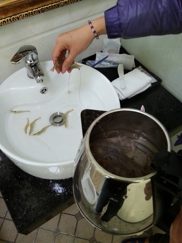但总不能吃虾刺身吧,在酒店没有炊具,但要发扬吃货的精神,只能就地取材。
