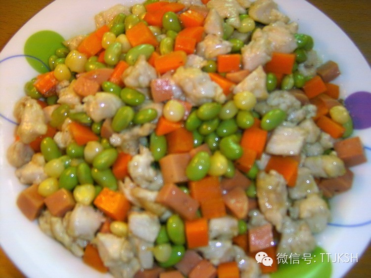 (4)锅中余油继续加热,放入胡萝卜、毛豆及两勺水,翻炒3分钟至熟,加入炒好的鸡丁及盐、胡椒粉混合炒匀,即可盛出。