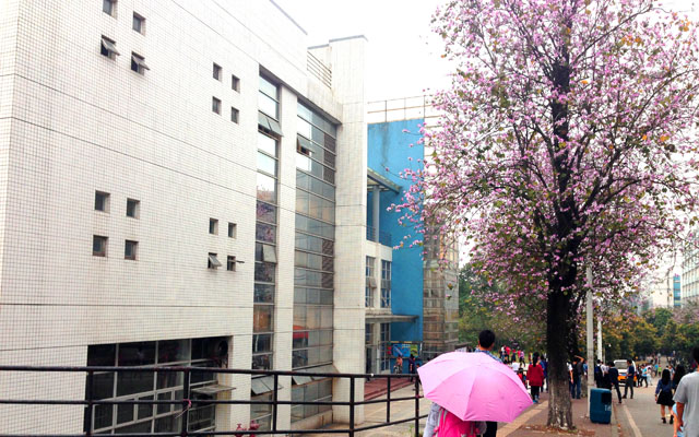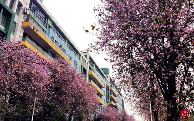 第四教学楼,沿着楼梯可以上山,从山上俯瞰山下紫荆花更是另一番风景~