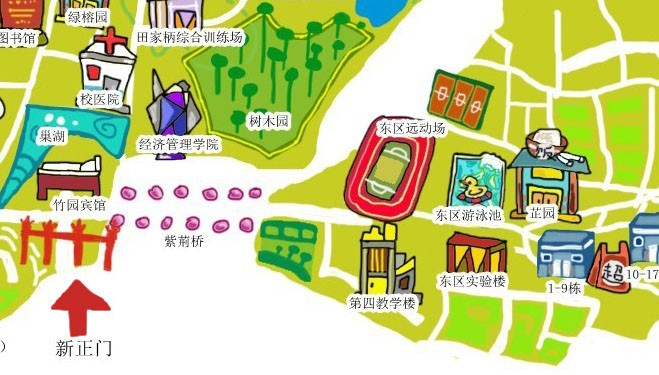 路线三:新正门进——紫荆桥——东区球场运动——芷园吃一顿——第四教学楼——湿地公园——行政楼
