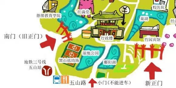 路线一:南门进——行政楼——湿地公园——紫荆桥——东区球场运动——芷园吃一顿——第四教学楼