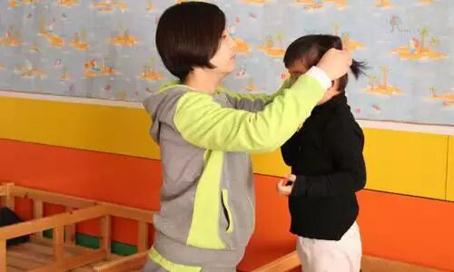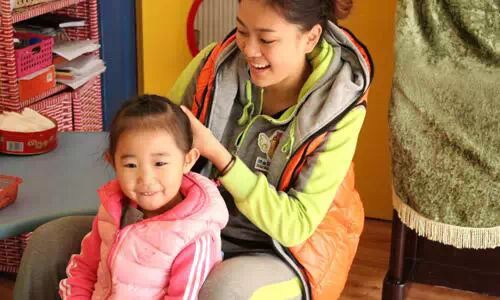 ↑↑李老师为刚睡醒的每个小女孩们梳起漂亮的小辫。