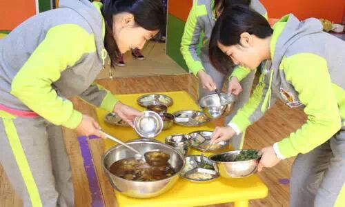 ↑↑小班每个班配有四名老师,其中一位是主班老师,两位配班老师和一位生活老师。早上不到七点半,老师们已经匆忙来到园里,换上运动服,匆忙的吃着早餐。