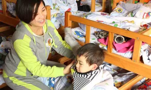 ↑↑保育老师在看着孩子睡觉,孩子上厕所,细心为孩子穿上外套,孩子蹬了被子,急忙又帮孩子盖被子。