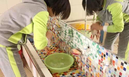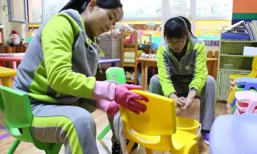 ↑↑生活老师已经在教室里准备好孩子们喝的热水,并为每一个小椅子进行擦拭消毒。