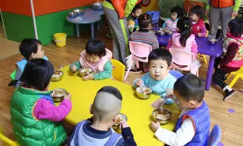 ↑↑八点十分,孩子来的差不多了。保育老师已经将孩子们的饭分好,并且辅助孩子进行早餐。